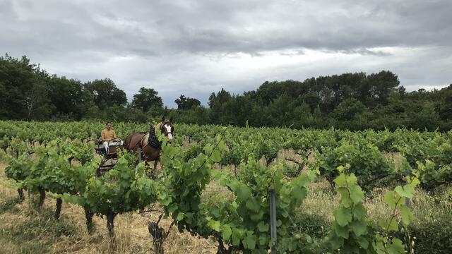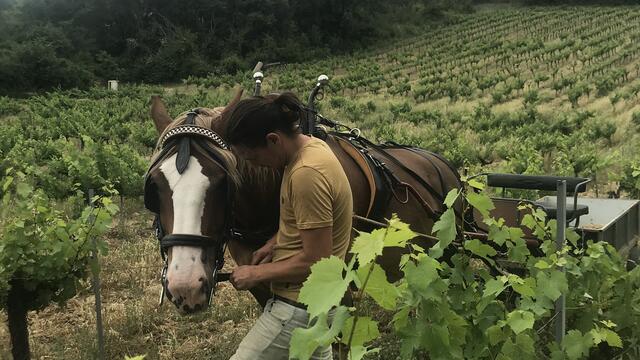 Simon travaille en agriculture biologique de manière à respecter au mieux l'environnement, mais aussi les hommes qui viennent l'aider. Sentus, le cheval, prend part aux activités du domaine et réalise auprès de Simon les tâches dans les vignes.