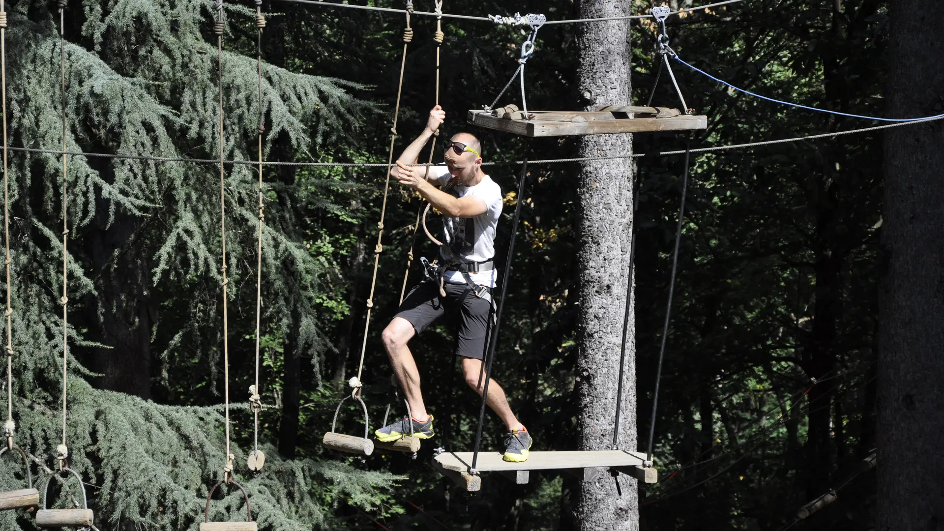 Équipés de baudriers et d’un système de ligne de vie continue, les jeunes aventuriers découvrent leurs premières sensations d’équilibre : tyroliennes, marches aériennes, balançoires, boîte à savon, ponts suspendus…