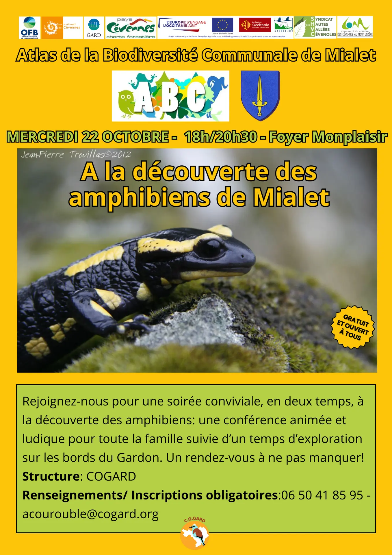 Dans le cadre de l'atlas de la biodiversité de la commune, la Cogard propose d'assister à une soirée conviviale à la découverte des amphibiens. Une conférence animée et ludique, sera suivie d'un temps d'exploration sur les bords du Gardon.