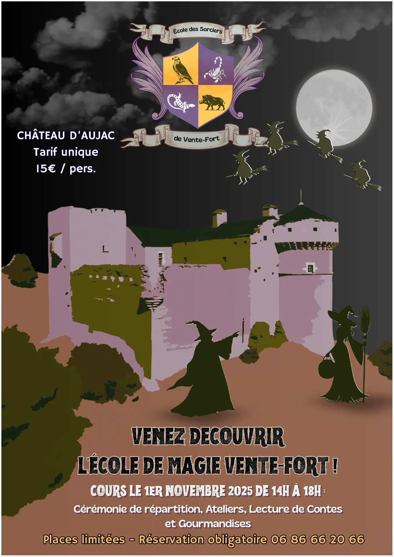 Le Château d'Aujac invite petits et grands à l'École de Sorcellerie de Vente-Fort pour une cérémonie de répartition, ateliers, lecture de contes et gourmandises!