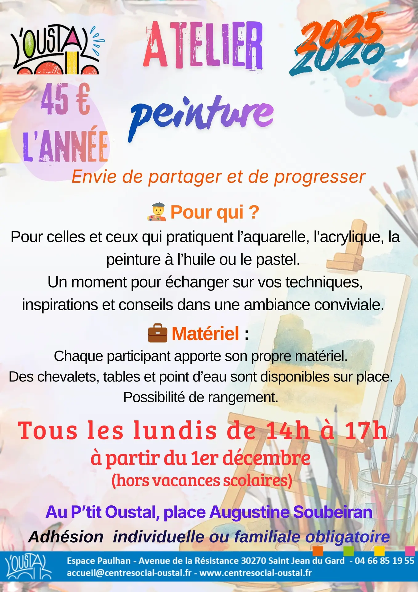 L'Oustal propose un atelier peinture pour partager et progresser dans la pratique de l'aquarelle, l'acrylique, la peinture à l'huile ou encore le pastel. Vous partagerez vos techniques, inspirations et conseils dans une ambiance conviviale.