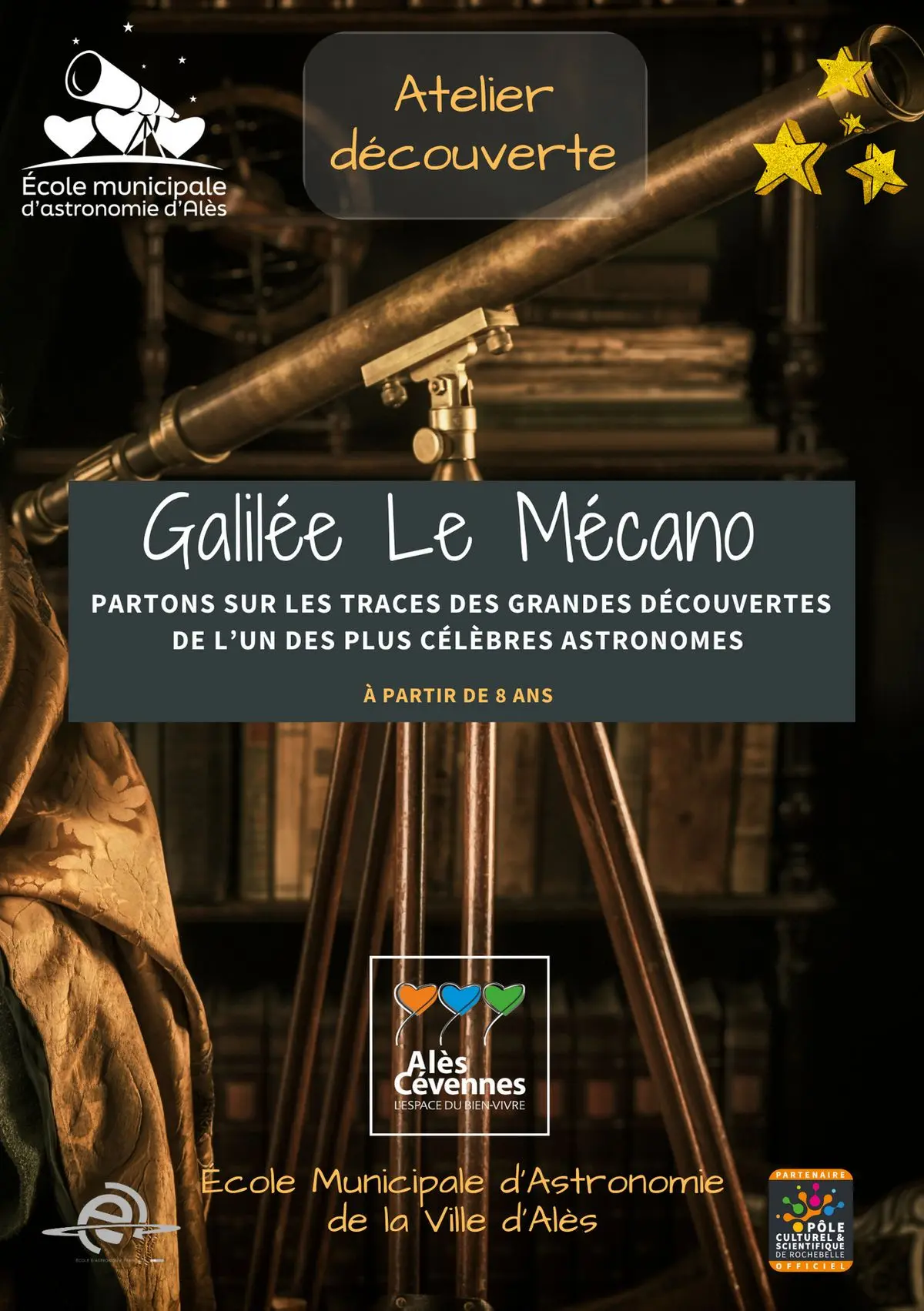 Nous irons sur les traces d'un des plus célèbres astronomes du XVIIème siècle. Galilée est le premier homme à diriger une lunette vers les étoiles, ce qui lui permit de faire de nombreuses découvertes sur la Lune, le Soleil et les planètes. Pour apprendre les principes de l'optique, les enfants devront construire une petite lunette astronomique.