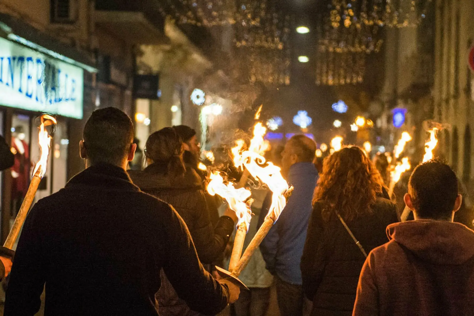 Déambulation enflammée à travers le village et vin chaud offert à l’issue du parcours.