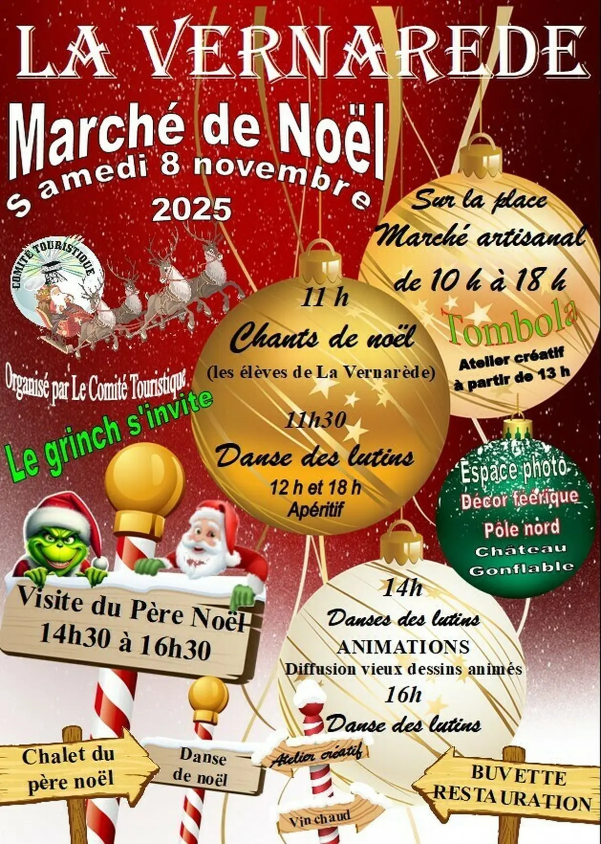 Stands d’artisans et créateurs, chants de Noël, visite du Grinch et du Père Noël, animations pour les enfants, …