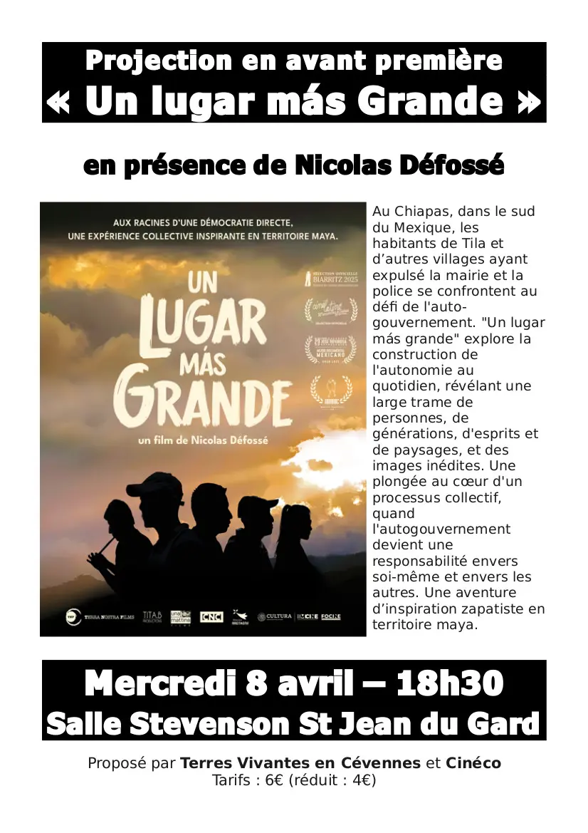 Projection en avant-première du film « Un lugar más grande », en présence de Nicolas Défossé. Le film explore la construction de l’autonomie au quotidien et l’autogouvernement au Chiapas (Mexique), une aventure d’inspiration zapatiste en territoire maya.