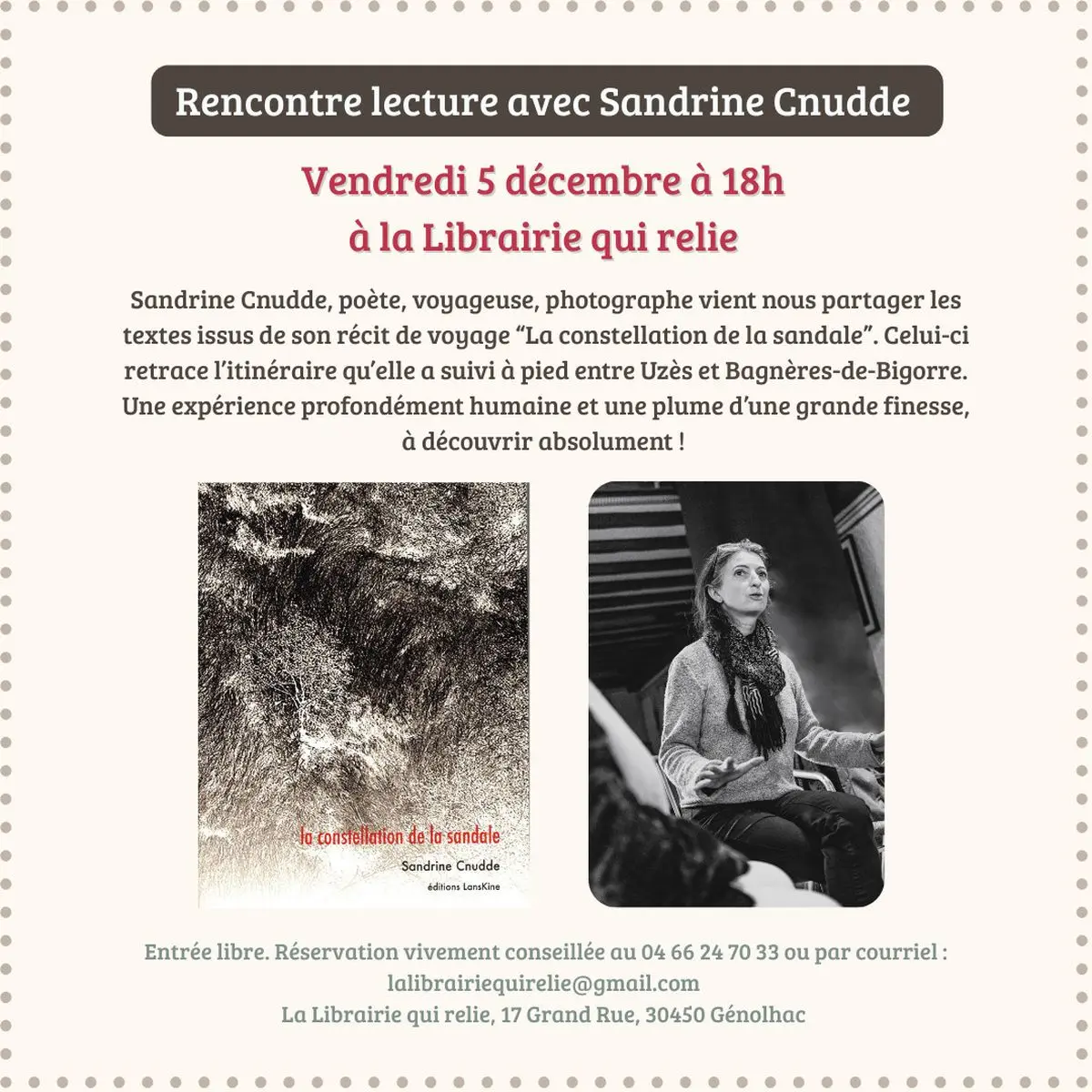 La prochaine rencontre à la Librairie sera ponctuée de lectures avec de Sandrine Cnudde, poétesse, voyageuse, photographe, qui viendra lire des extraits et parler de son livre La constellation de la sandale paru aux éditions Lanskine.