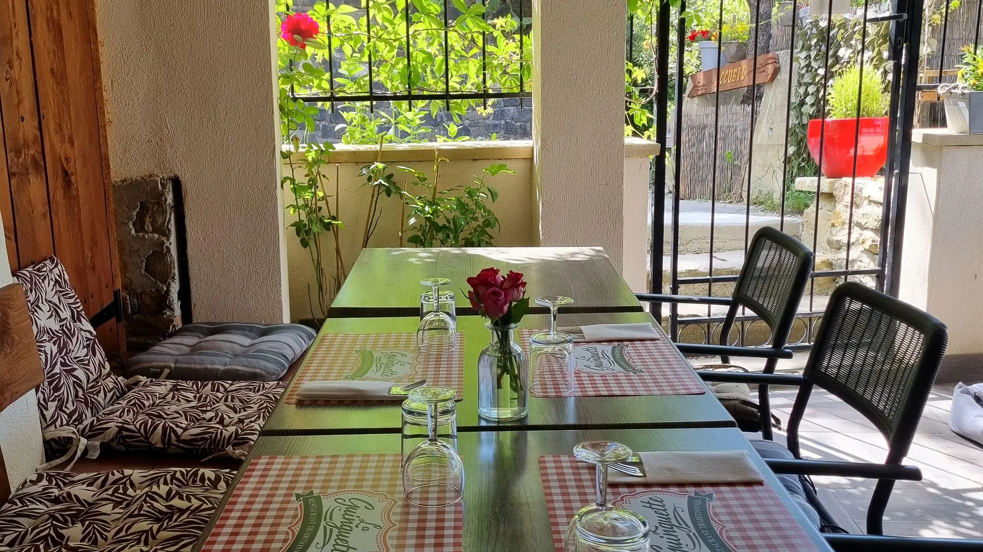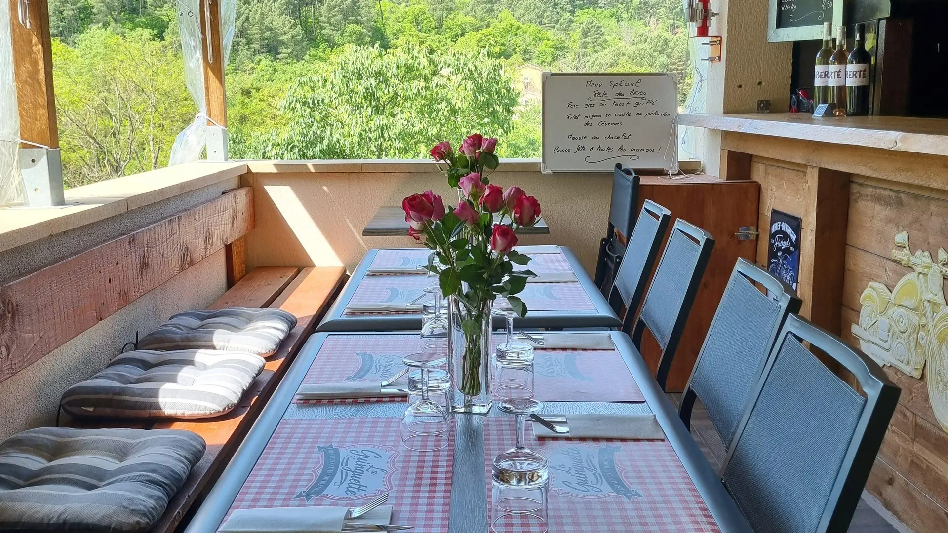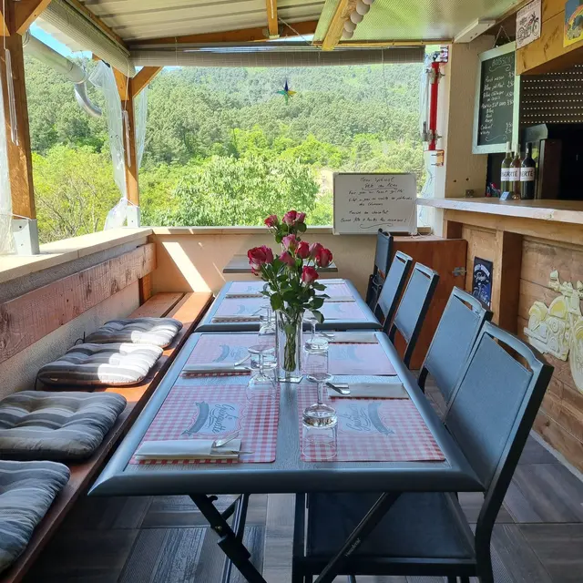 Le restaurant guinguette du gîte de la tourterelle vous propose des menus avec des produits frais du terroir midi et soir, sur une terrasse couverte avec vue sur la montagne.