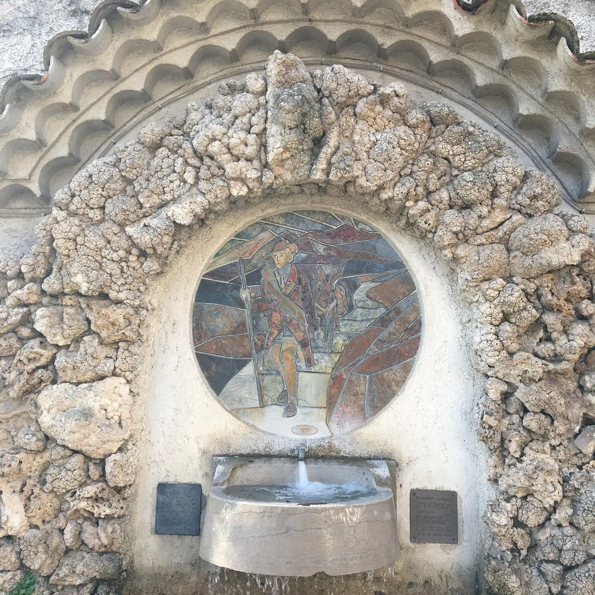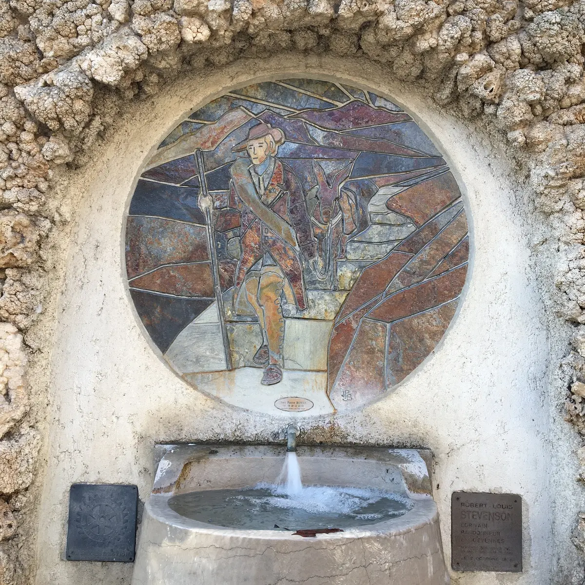 La fontaine commémore l'arrivée de Robert Lewis Stevenson à St Jean du Gard le 2 octobre 1878.
