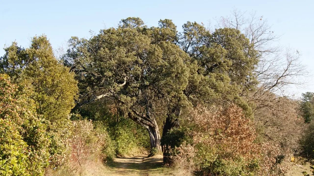 Cette espèce de genévrier oxycèdre couvre habituellement les paysages de garrigue mais sa taille ne dépasse pas un buisson.