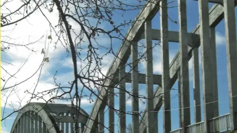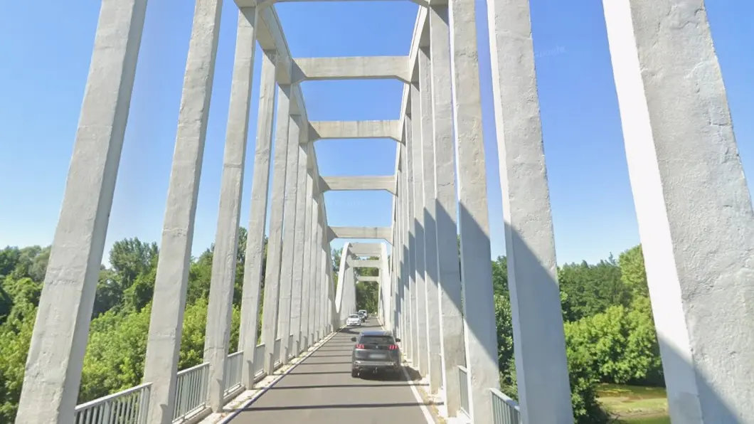 C'est un pont bow-string, c'est à dire le même principe qu'un arc. L'avantage de ce pont est que les efforts d'appuis ne sont que verticaux et le faible encombrement sous le tablier permet aux embâcles de passer facilement en cas de crue.