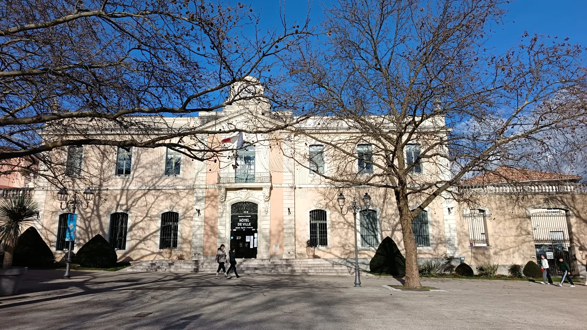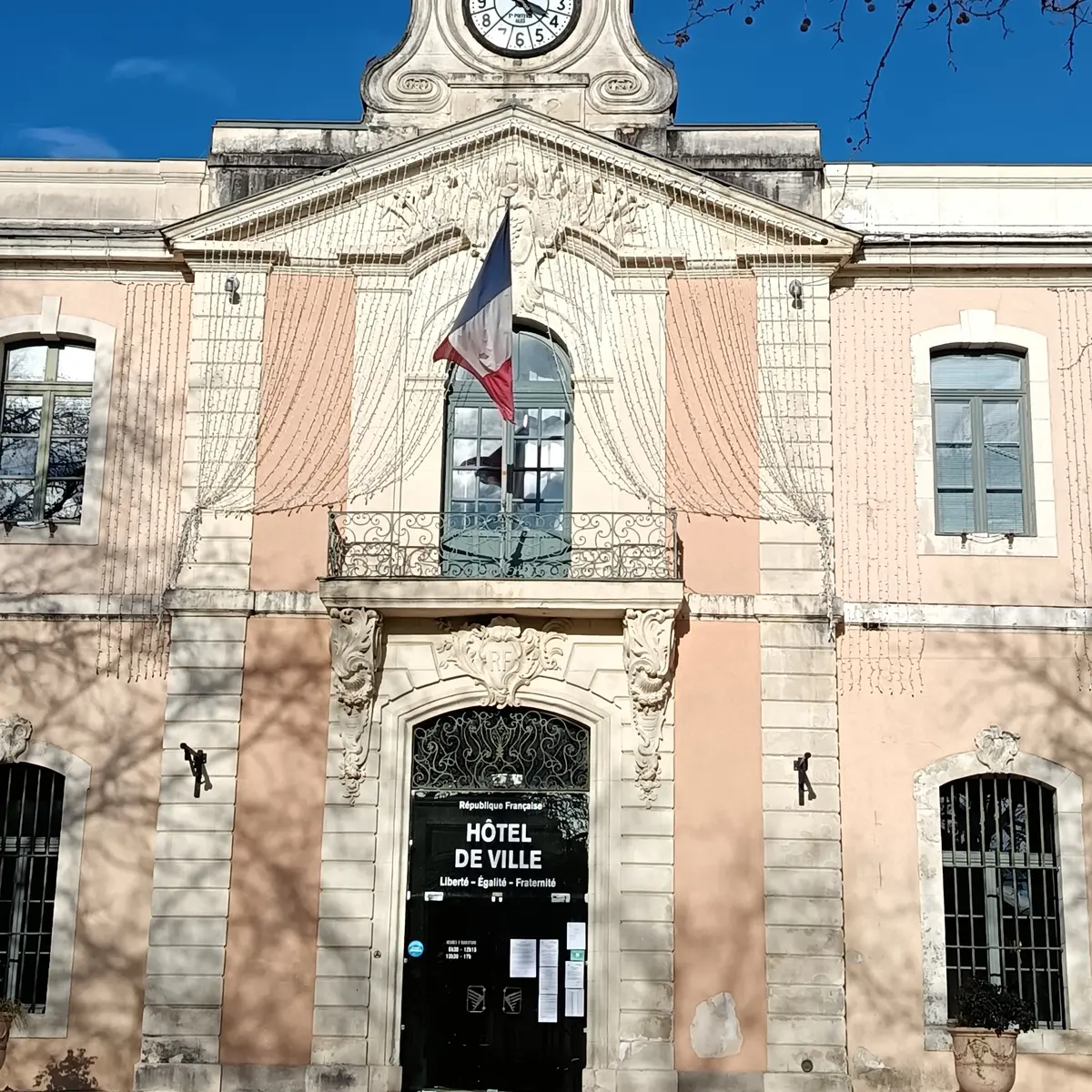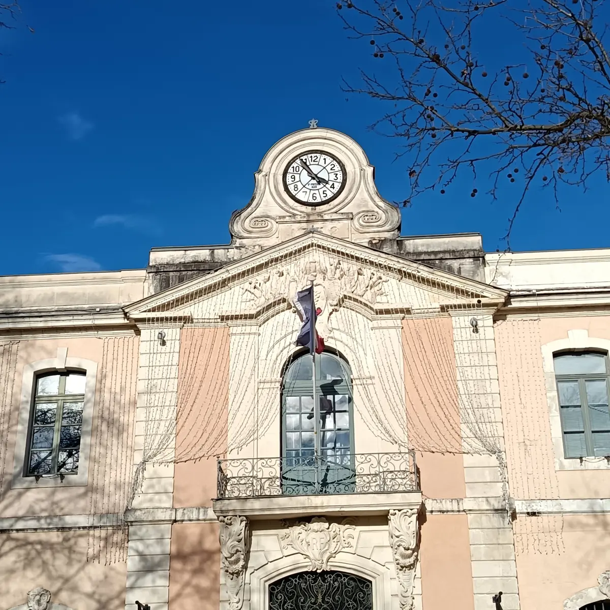 La façade extérieure se distingue par son balcon à consoles, surmonté d'un fronton orné d'un médaillon représentant les armes de la ville, placé au milieu d'un faisceau de drapeaux.
