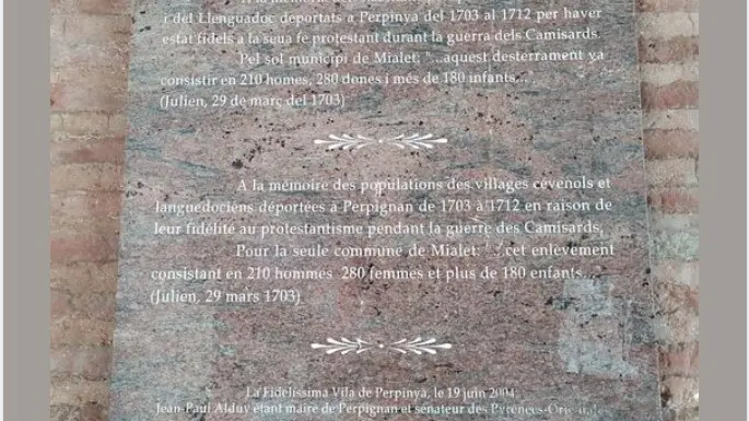 Cette plaque commémore la déportation de 670 personnes restées fermes dans leur foi protestante ainsi que des catholiques les ayant soutenus vers les prisons royales de Perpignan, le 23 mars 1703.