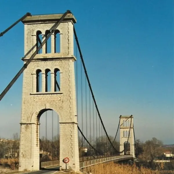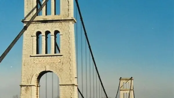 En octobre 1908, le département décide la reconstruction du pont au même emplacement mais fait le choix d’un pont suspendu à une seule travée pour ne pas obstruer la rivière.