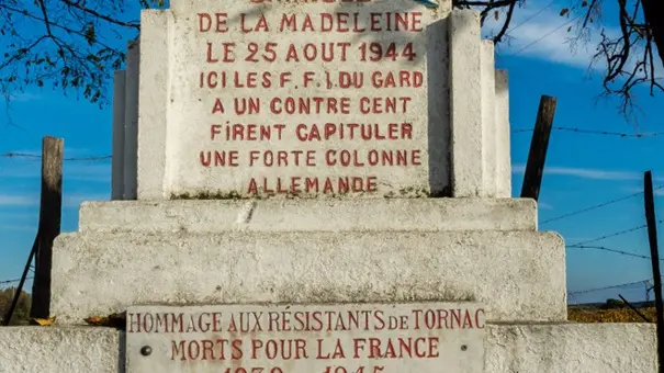 La seconde stèle porte les inscription suivante "Bataille de la Madeleine, le 25 aout 1944, ici les FFI du Gard, à un contre cent, firent capituler une forte colonne allemande". Elle rend aussi hommage aux résistants de Tornac morts pour la France pendant la Guerre de 1939-1945.